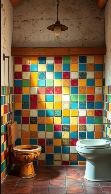 The tile design in the image highlights a beautiful mix of colors that work seamlessly together. Each tile seems to tell its own story, adding depth and texture to the walls. Subtle variations in tone enhance the rustic charm, making even a small bathroom feel spacious and welcoming.