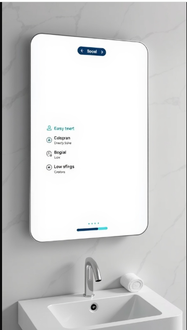 The image features a sleek, minimalist smart mirror that represents the future of bathroom technology. More than just a reflective surface, this mirror serves as an interactive hub for information and entertainment, combining modern design with practical innovation.