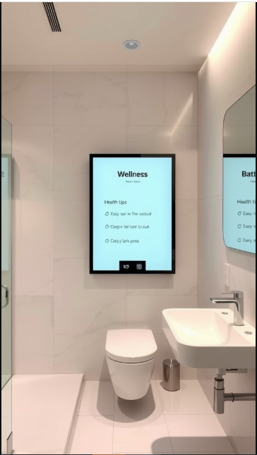 Step into a bathroom that perfectly balances modern design with practical functionality. The image showcases a sleek, minimalist space featuring a digital wellness screen—an innovative addition that makes it easy to access health tips while going about your daily routine.