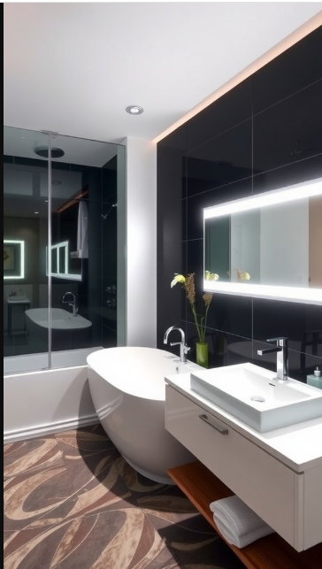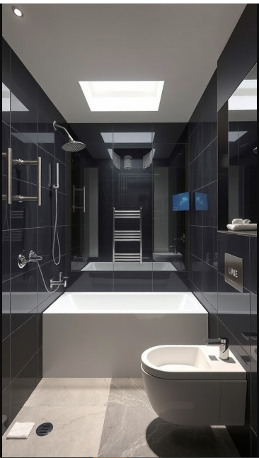 The minimalist design, enhanced by bold black tiles, creates an atmosphere that is both clean and sophisticated. At the heart of this concept is the seamless integration of smart devices—tools that can track water usage, adjust temperatures, and even send reminders when it’s time to restock essentials.