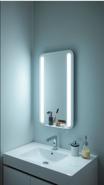 Minimalist in style yet striking in presence, the mirror features bright LED side lights that provide excellent illumination while creating a warm, inviting glow. The reflection reveals an organized space, with essentials like brushes and makeup neatly arranged for easy access.