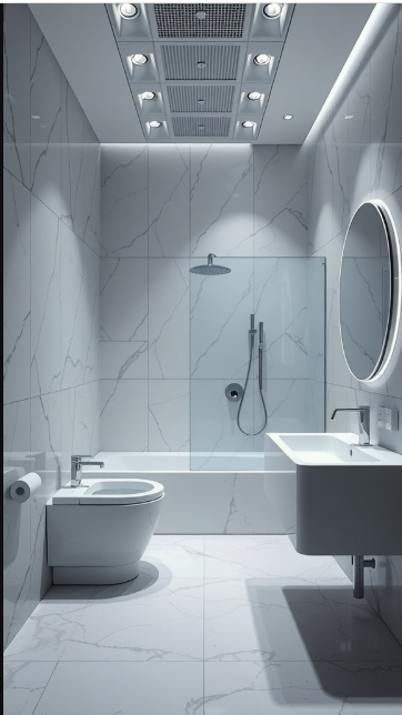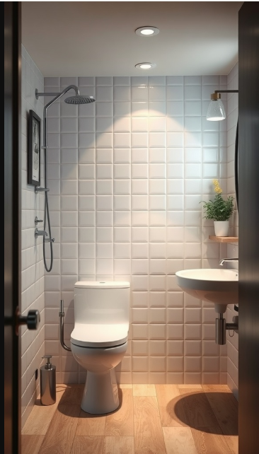 Imagine walking into a bathroom that feels both contemporary and eco-conscious. The design is bright and minimal, with soft lighting and natural textures that create a calming atmosphere. But beyond style, this space integrates sustainable technologies to make your daily routine more environmentally friendly.