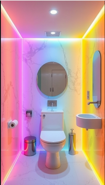 The bathroom in the image exudes a vibrant, playful energy thanks to its creative use of colorful lighting. Instead of relying on traditional white or neutral tones, rainbow hues wash across the walls, instantly transforming the mood of the space into something lively and inviting.