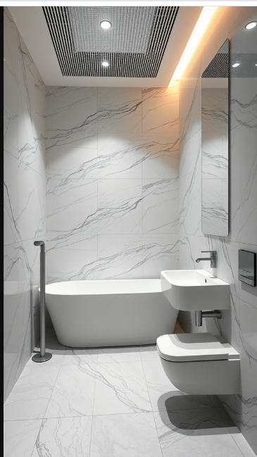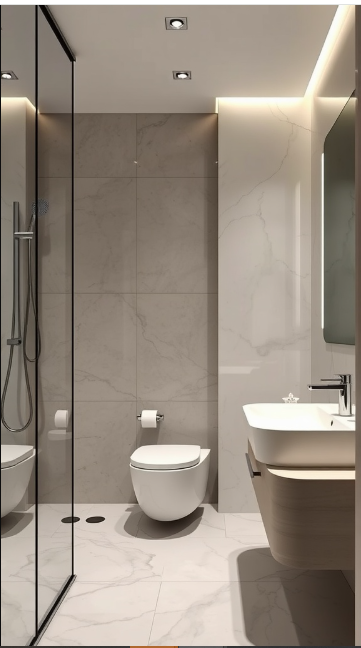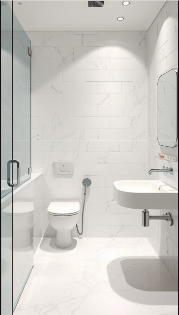 The marble-inspired tiles bring elegance while actively repelling dirt and grime. Resistant to stains and buildup, they allow you to spend less time scrubbing and more time enjoying your space. A minimalist sink and toilet further support the easy-clean concept, making daily upkeep simple and stress-free.