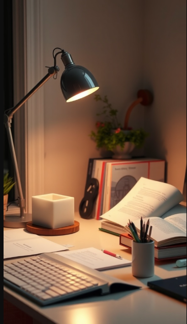 Lighting also plays a key role—a focused desk lamp not only reduces eye strain during late-night sessions but also adds warmth and balance to the space. A touch of greenery, like the small plant here, brings life to the desk, improving air quality and creating a more inviting atmosphere.