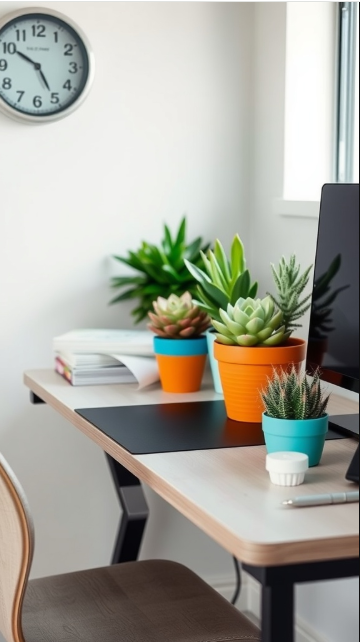 When choosing succulents, consider combining several varieties to craft a dynamic display. Brightly colored pots—like orange or teal—contrast beautifully with the greenery, infusing personality and charm into your workspace. Just be sure to pick containers with proper drainage to keep your plants thriving.