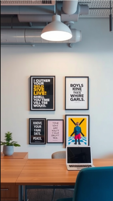 Wall art has the power to completely transform an office, turning it into a space that feels dynamic, inspiring, and uniquely personal. In this setup, a gallery of framed prints combines bold typography with playful illustrations, each piece offering its own message and charm.
