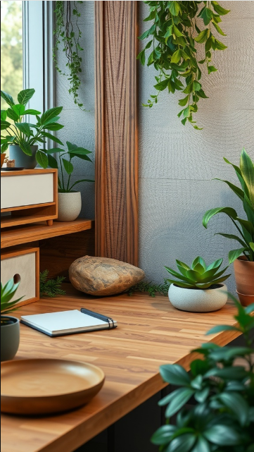 Bringing nature into your office can transform it from a standard workspace into a soothing retreat. This setup demonstrates how plants and natural materials can create an environment that feels both organized and restorative.