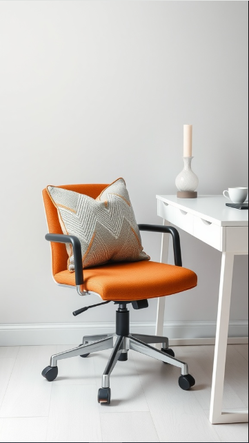 Stylish chair cushions are a simple yet impactful way to upgrade your office decor. They bring both comfort and a splash of personality to your workspace. In this setup, a bold orange chair is paired with a textured cushion that not only adds visual interest but also enhances the overall look.
