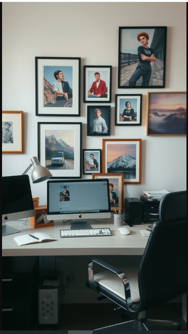 Artwork is one of the easiest ways to infuse personality into your office. In this example, a thoughtfully arranged gallery wall showcases a mix of framed portraits and landscapes, turning a blank wall into a source of inspiration and conversation.