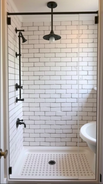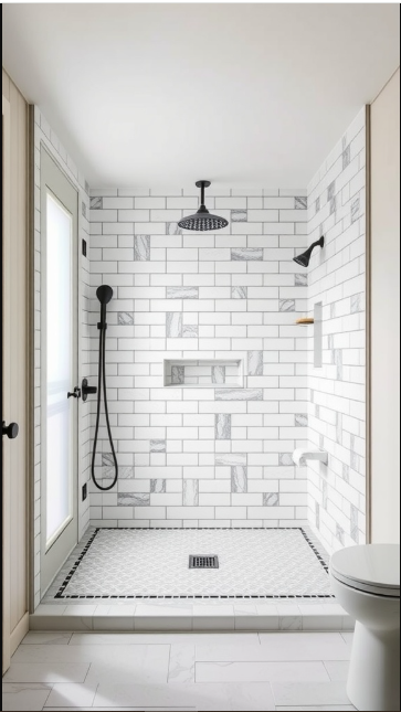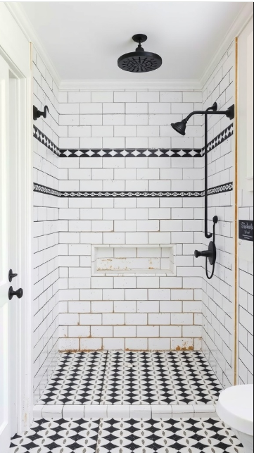 In farmhouse bathroom design, bold black-and-white patterns can bring striking character to the space. This shower showcases a beautiful mix of crisp white tiles and dark accents, blending modern style with rustic charm.
