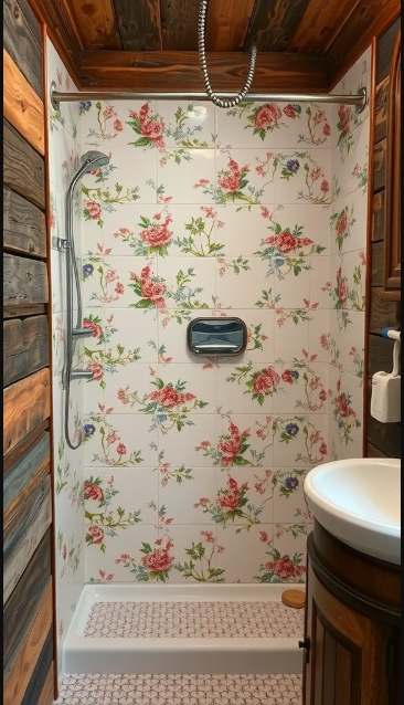 Paired with rustic wood accents—like the natural paneling shown here—the floral tiles beautifully enhance the farmhouse aesthetic. It’s a seamless blend of vintage style and modern comfort.