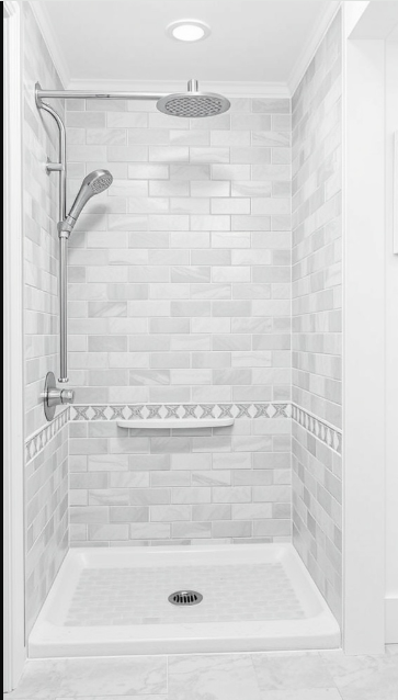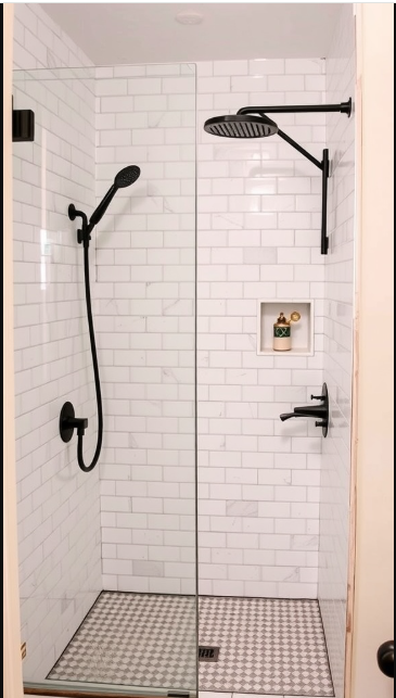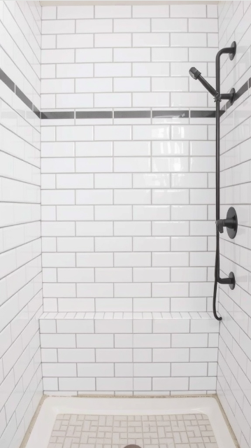 This shower design keeps things simple yet functional, featuring a built-in bench for added comfort. Sleek black fixtures pair effortlessly with the white tiles, introducing a modern edge that balances beautifully with the traditional aesthetic.