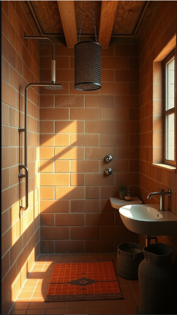 Terracotta tiles bring a timeless warmth to farmhouse bathrooms, making them an ideal choice for creating a cozy retreat. In this design, the shower is wrapped in rustic terracotta, with its earthy tones setting a relaxed, inviting mood—perfect for unwinding after a long day.