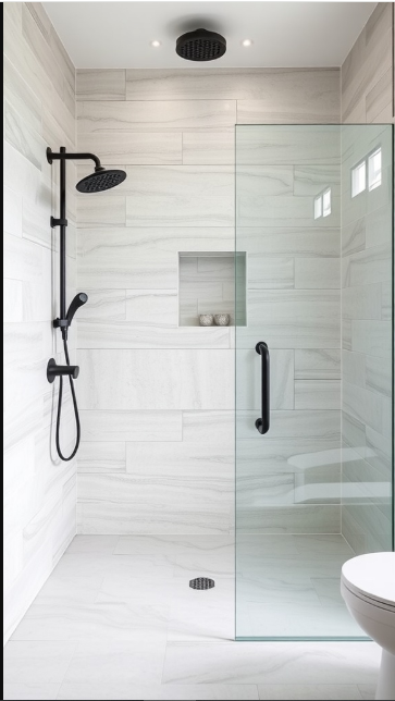 A minimalist glass enclosure pairs perfectly with the large tiles, keeping the focus on their smooth surface and adding a modern, streamlined touch. Plus, the reduced need for scrubbing grout is a practical bonus for everyday use.