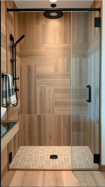 In farmhouse-style bathrooms, rustic barnwood tile designs are a timeless favorite. They bring warmth, texture, and character, turning the shower into a cozy retreat. This design highlights a beautifully tiled shower that perfectly embodies that inviting farmhouse feel.