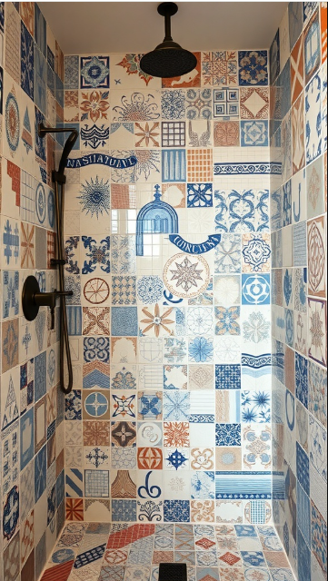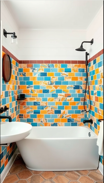 Bold colors can bring a refreshing twist to farmhouse bathroom design, making the space feel vibrant and full of personality. In this shower, a lively mix of blues and oranges creates a striking backdrop that draws the eye without overwhelming the room.