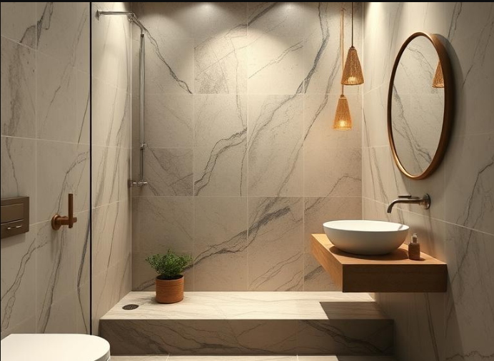 Light Marble Bathroom with Wood Accents