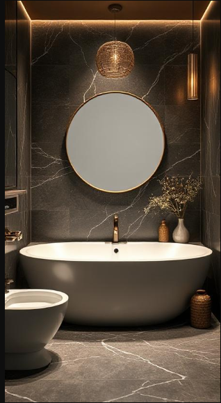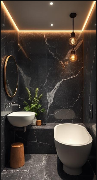Dramatic Dark Marble Bathroom with Ambient Lighting