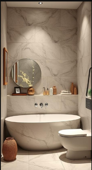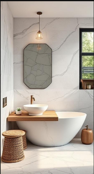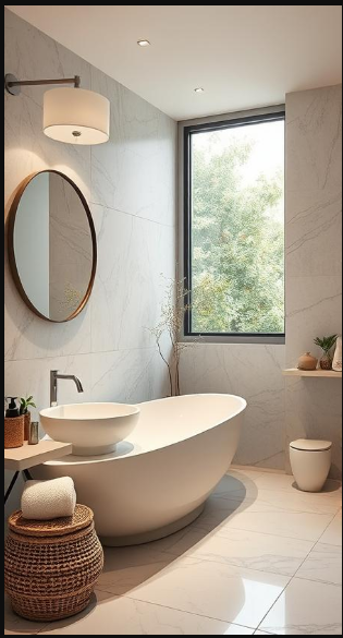 This bathroom exemplifies the Japandi style through a harmonious blend of light marble walls and warm wood accents. Subtle marble veining adds visual interest without overpowering the space, while the wooden vanity brings natural warmth. The freestanding bathtub offers a clean, sculptural focal point, and woven baskets add texture and practicality—merging Scandinavian functionality with Japanese aesthetics for a calm, serene bathing experience.