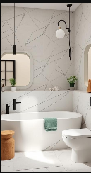 Artistic Line Pattern Wallpaper in Neutral Bathroom