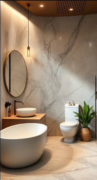 This bold take on Japandi style features dark marble with striking white veining, creating an elegant and dramatic visual effect. Ambient ceiling lighting casts a warm glow across the dark surfaces, reflecting the Japanese concept of wabi-sabi—finding beauty in imperfection. A round mirror with a brass frame adds warmth, while a simple vessel sink preserves minimalist functionality. Carefully placed greenery softens the intense palette, balancing drama with natural serenity.