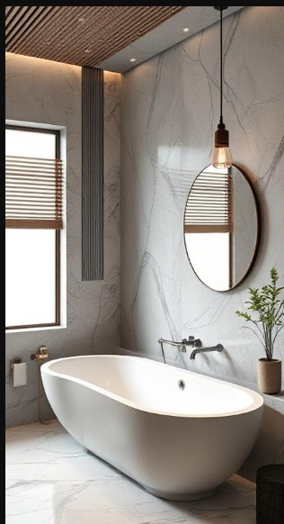 This refined bathroom showcases a wood-slat ceiling that brings warmth and texture to the space. A minimalist pendant light offers focused illumination without distraction, while the freestanding tub’s sleek lines create a sculptural statement against the marble backdrop. A circular mirror gently softens the room’s angular architecture, and sheer window treatments filter natural light with subtle elegance. The result is a harmonious blend of Japanese minimalism and Scandinavian comfort.