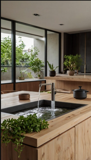 Incorporating a water feature, such as a small fountain or indoor waterfall, can add a soothing sense of calm to your Japandi kitchen. These elements reflect the natural beauty of flowing water, creating a peaceful focal point that enhances the room’s serenity.