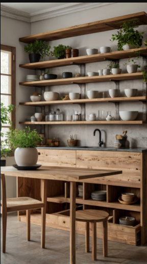 In a Japandi kitchen, every piece of furniture is designed with purpose and versatility in mind. A built-in desk with storage underneath, for example, can function as both a workspace and a convenient spot to keep cookbooks or everyday essentials neatly organized.
